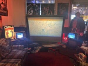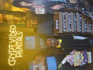 Now, Crypt Video Rentals is worth the price of admission for the experience alone. Hosted at Neshaminy Creek Brewing in Croydon, Pennsylvania, the event is a combination of a video store experience, vendor market and movie screening. The expansive area, usually reserved for brewing beer, is transformed by the efforts of Nugent and his rogues gallery of weirdos (most of whom I count as my friends). Vintage View Cinemas handles the projection of the headlining flicks while Morningside Goods does the Devil’s work of