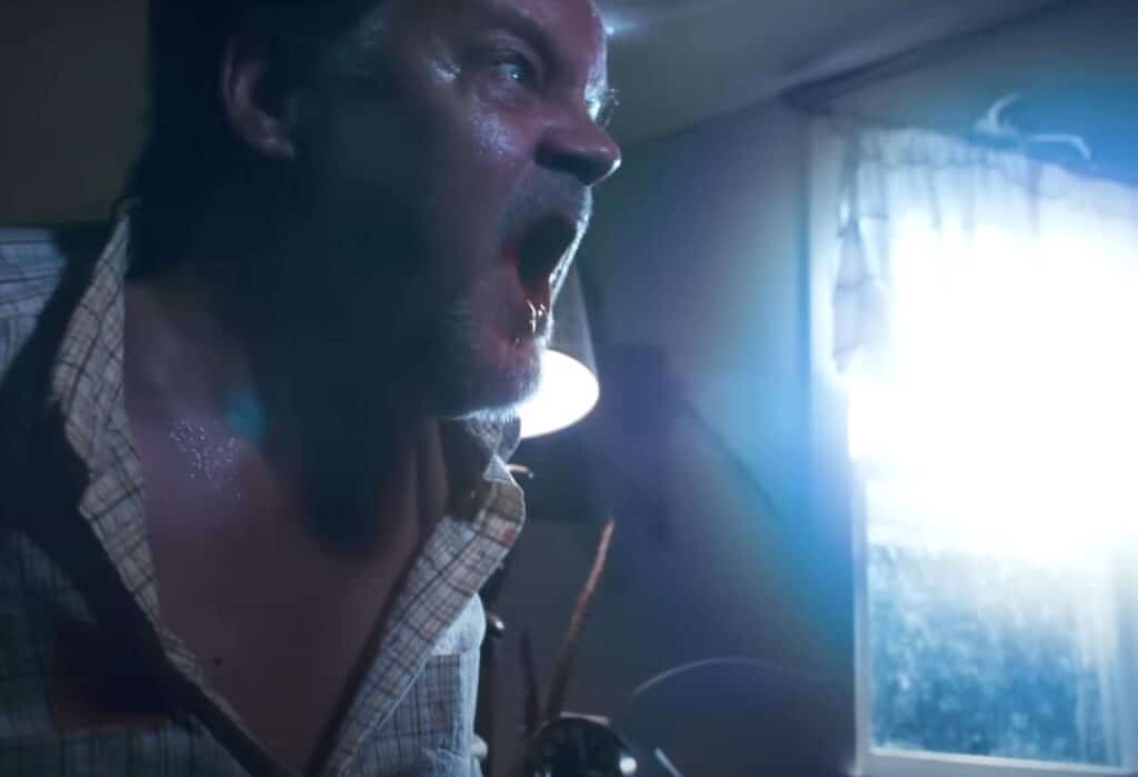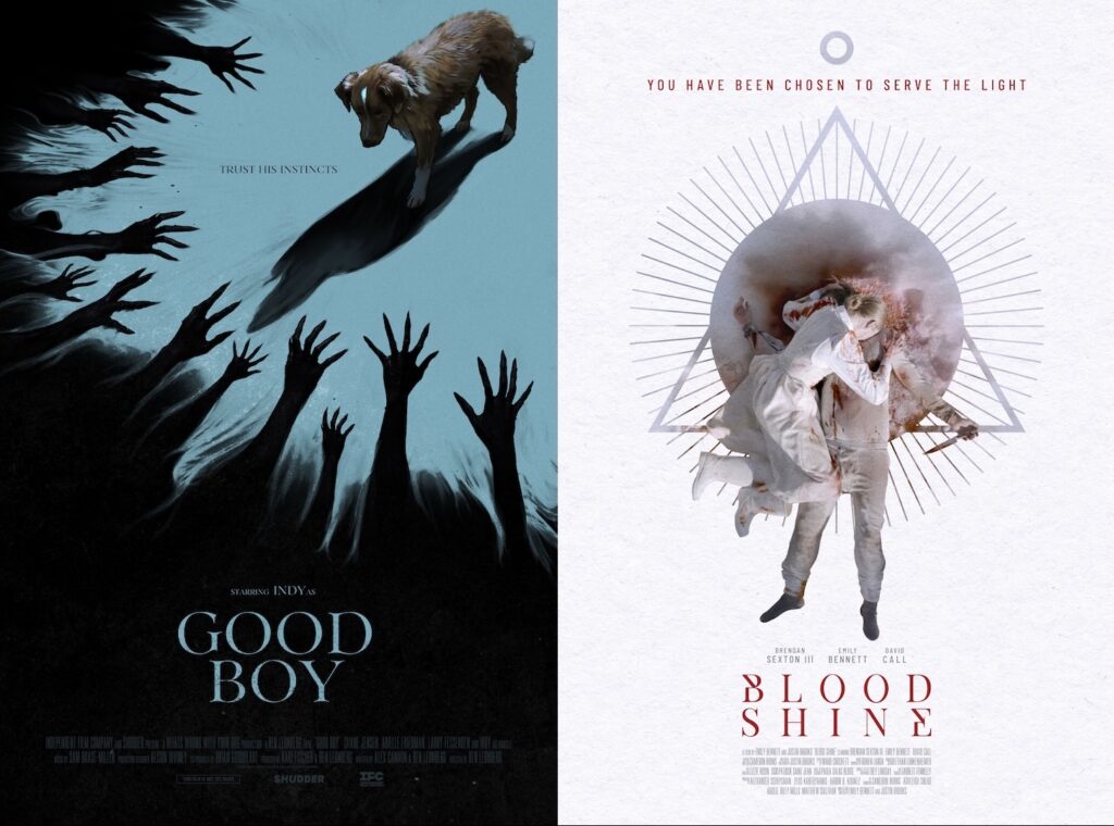 In GOOD BOY, currently in release from the Independent Film Company and Shudder, Fessenden plays the grandfather of protagonist Todd (played physically by director Ben Leonberg and vocally by Shane Jensen). Todd has moved into the remote home formerly owned by his recently deceased relative, who appears on old VHS cassettes Todd watches; meanwhile, Todd’s dog Indy (playing himself), from whose point of view the story is told, begins to detect malignant spirits lurking about (see our GOOD BOY review here). In BLOOD SHINE (pictured above), currently touring the fest circuit (it screens Thursday, October 23 at the Brooklyn Horror Film Festival), Fessenden is also seen on video as well as in the main body of the movie, playing the leader of a cult in which heroine Clara (Emily Bennett, who wrote and directed with Justin Brooks) becomes enmeshed.