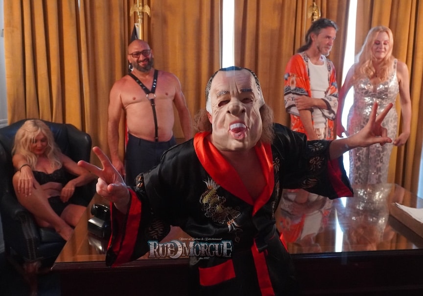 “Finding myself Full Monty with my balls resting on the presidential desk, while a nude man in a Nixon mask yelled, ‘I am not a crook!’ was not even remotely the most shocking part of this movie!” May promises, and Spross says, “It’s hard to believe that SUNSET STRIP KILLERS marks my 15th movie with Chad Ferrin. I obviously love working with him. He sets a calm tone yet doesn’t waste time, as we hear him say, ‘Good for camera? Moving on.’ Not only was this the most fun set I’ve worked on, we finished day 12 with a killer live band, The Gene Butler Band, which put everyone including the crew in a great mood. I think every set needs a live band.”