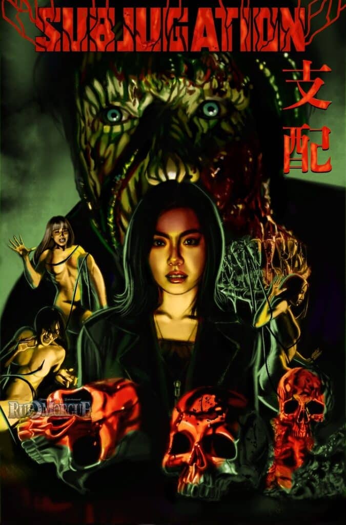 Writer/director/producer Doug Roos (BAKEMONO, THE SKY IS FALLING) sent along the exclusive poster (by Justin Cook) and images seen below for his latest movie, SUBJUGATION. The film, which he’s starting to send out to festivals, stars Karen Yoshida, Tsukasa, Atsuto Fujita and Hideyuki Chida; Jun’ichi Yamamoto, director of the two MEATBALL MACHINE movies, is the executive producer. The synopsis: “Beneath the glossy exterior of Japanese society, they pull the strings of everything. Rich powerful men who can transform into monsters at will and brainwash others with their insidious signal. In this not-too-distant future, more and more women fall prey until Tokyo’s streets reek of death.”