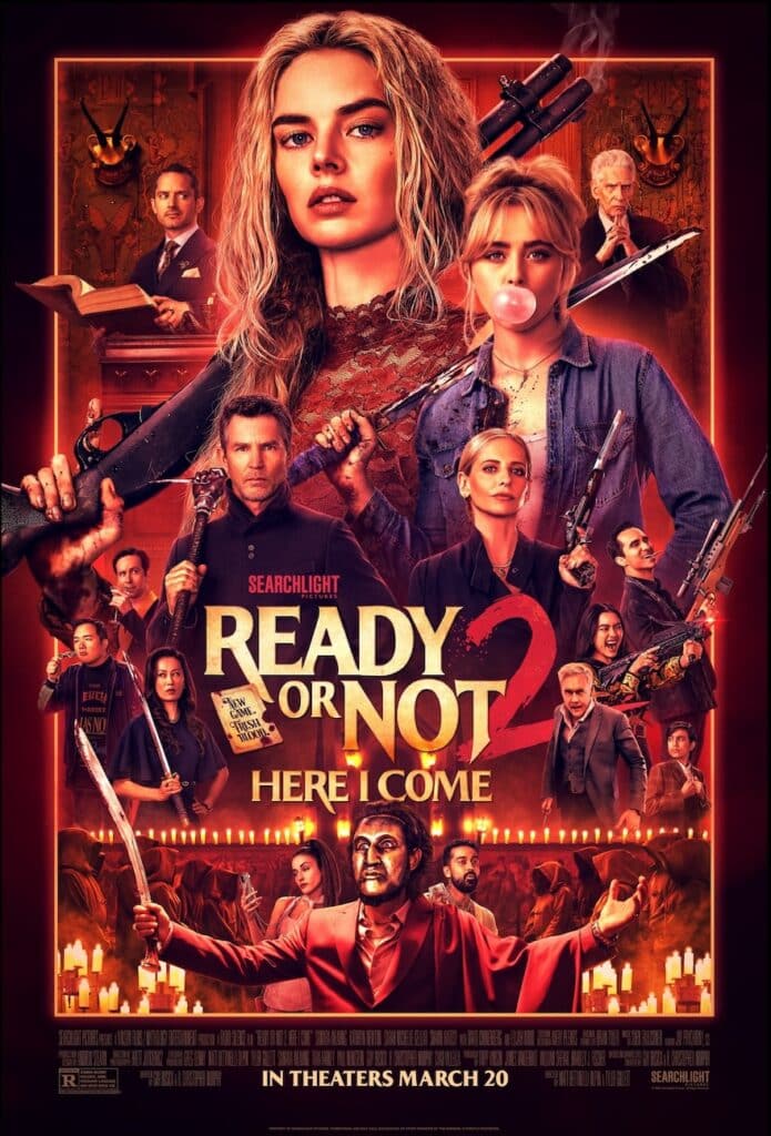 Searchlight Pictures brings READY OR NOT 2: HERE I COME to theaters nationwide March 20. Directors Matt Bettinelli-Olpin and Tyler Gillett, screenwriters Guy Busick and R. Christopher Murphy and star Samara Weaving all return from the much-loved original, joined by Kathryn Newton (FREAKY), BUFFY THE VAMPIRE SLAYER’s Sarah Michelle Gellar, Shawn Hatosy (THE FACULTY), Nestor Carbonell and genre favorites Elijah Wood and David Cronenberg. The synopsis: “Moments after surviving an all-out attack from the Le Domas family, Grace [Weaving] discovers she’s reached the next level of the nightmarish game—and this time with her estranged sister Faith [Newton] at her side. Grace has one chance to survive, keep her sister alive, and claim the High Seat of the Council that controls the world. Four rival families are hunting her for the throne, and whoever wins rules it all.”
