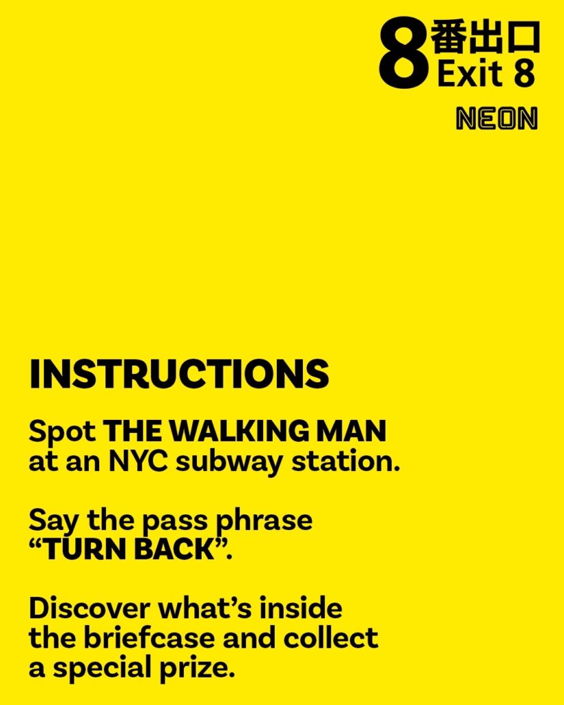 In EXIT 8, directed by Genki Kawamura (who discusses it here), based on the popular video game and released by Neon April 10, a subway passenger (Kazunari Ninomiya) becomes trapped in a perpetually looping tunnel. He quickly learns that he must spot and react to “anomalies” in order to escape, and while doing so, his path repeatedly crosses that of “The Walking Man” (Kochi Yamato). Today, Yamato, in full character as the Walking Man, will visit a number of Manhattan subway stations; you can see his route below. If you spot him and say the phrase “Turn Back,” you’ll get a prize. So New Yorkers, be on the lookout; just be sure you know where the nearest exit is!
