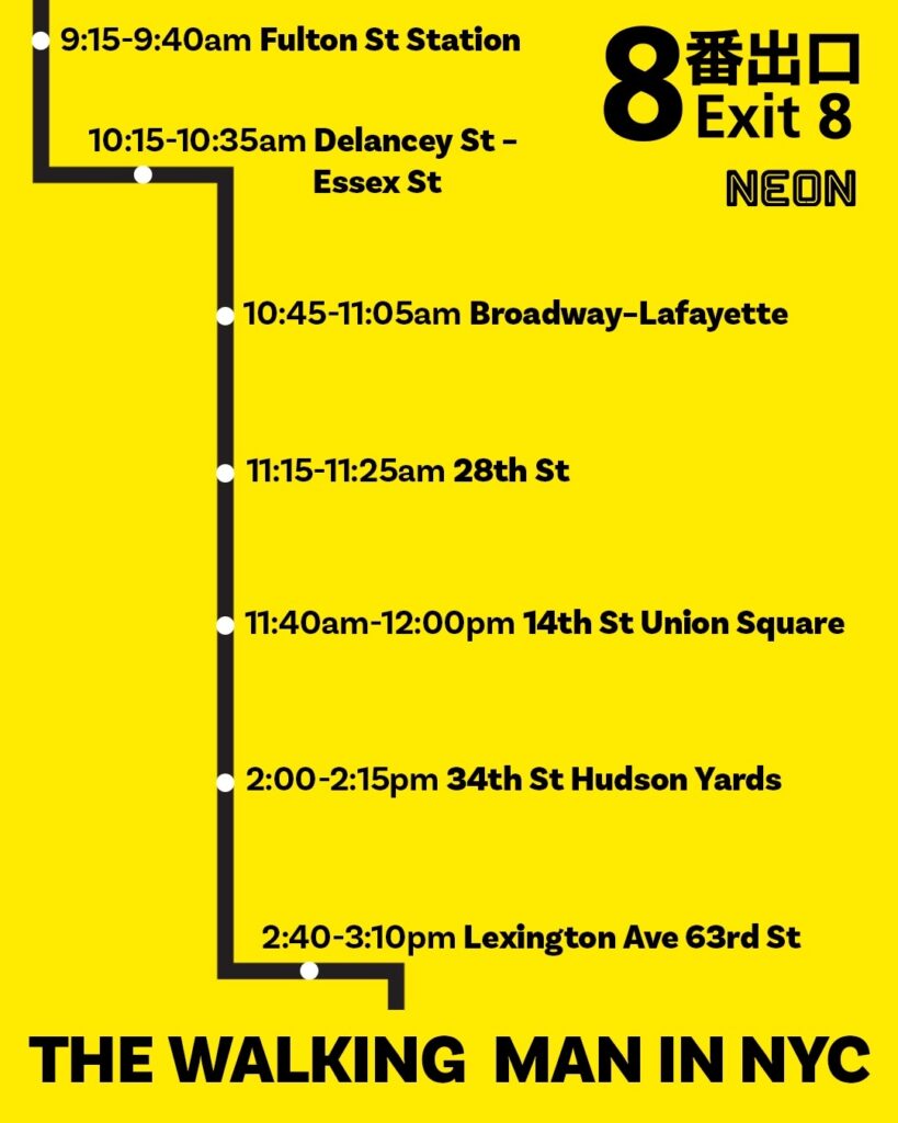In EXIT 8, directed by Genki Kawamura (who discusses it here), based on the popular video game and released by Neon April 10, a subway passenger (Kazunari Ninomiya) becomes trapped in a perpetually looping tunnel. He quickly learns that he must spot and react to “anomalies” in order to escape, and while doing so, his path repeatedly crosses that of “The Walking Man” (Kochi Yamato). Today, Yamato, in full character as the Walking Man, will visit a number of Manhattan subway stations; you can see his route below. If you spot him and say the phrase “Turn Back,” you’ll get a prize. So New Yorkers, be on the lookout; just be sure you know where the nearest exit is!