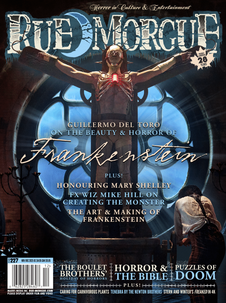 One of the most fertile imaginations in the genre today, director GUILLERMO DEL TORO breathes new life into Mary Shelley’s FRANKENSTEIN, the movie, he says, that he was born to make. Plus! del Toro reflects on 19-year-old MARY SHELLEY and her forebear, MARY WOLLSTONECRAFT; FX Wizard MIKE HILL on bringing Frankenstein’s lumbering creature to life, and a look at the OFFICIAL COMPANION BOOK to Guillermo del Toro’s Frankenstein. (RUE MORGUE #227 Nov/Dec Xmas 2025 Issue)