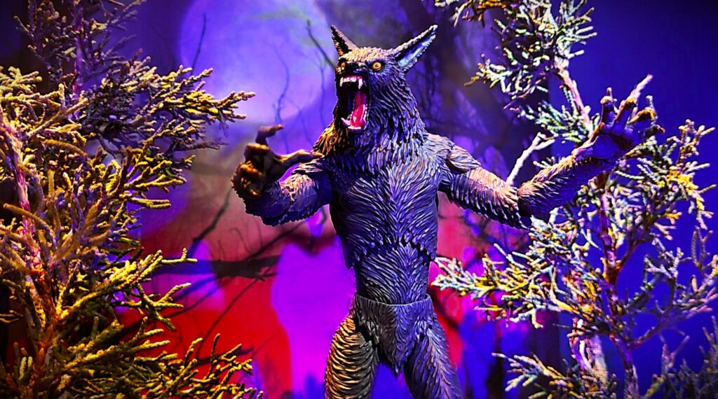The sculpting of the fur (which includes layered pieces to add bulk to the neck and covers articulation points on the shoulders, wrists and ankles), heads, hands and feet are very well done, and the paint apps (in particular, the gold-coloured eyes, mouth, fangs and claws) are excellent. The charcoal coloured plastic is dry brushed with shades of brown and gray to bring out the details. Though the elongated lupine-style legs look like they might cause issues for the figure when standing, this is not the case, and it can stand well unassisted. Syndicate has packaged the figure in a beautifully designed window-flap box (featuring spot varnish accents) with stunning illustrated artwork of the werewolf on the front and an image of the original 1981 movie poster on the inside flap. Kudos to the company for finally giving fans an action figure of this iconic movie monster.