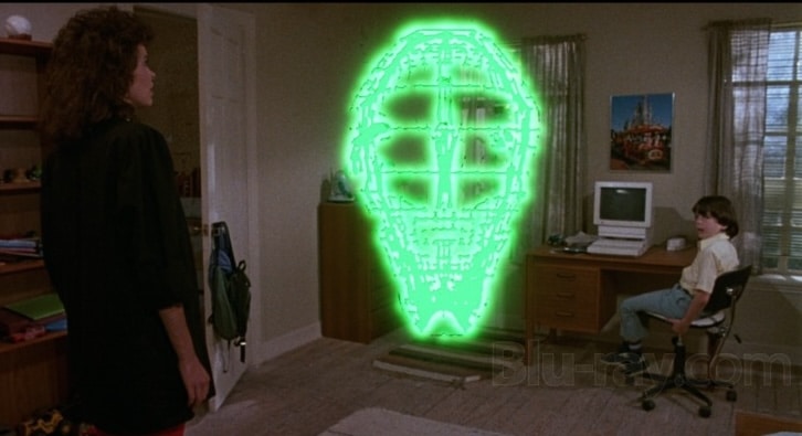 As the story evolves, we see more of those beloved ‘80s practical effects, makeup, and yes, computer graphics! Jason has an Apple II computer and, according to IMDb, is one of the first times it was featured in a film. The VFX in this scene are delightful and very reminiscent of 1981’s Evilspeak. (All hail, Clint Howard!) The makeup for David’s possessed look is monstrously superb, and the film’s final act, as Kate and Jason try to escape the mansion, succeeds on its own merits. That beloved ‘80s horror gore aesthetic shines with a man unzipping his scalp to reveal a pulsating brain, a talking, hanging dead body, a giant head and David/George’s face melting with his eyes gouged out. Then, his body opens like a cavern and his brain and internal organs spill out. Fun!