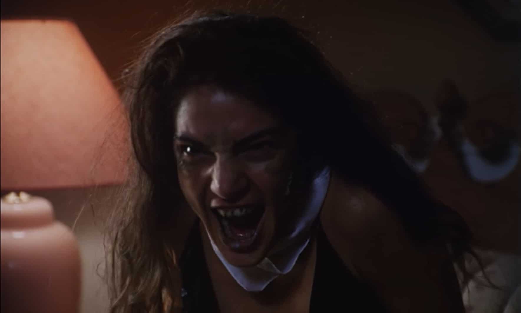 TEENAGE EXORCIST opens with a cleaning lady arriving at a large house for her daily duties. Finding a trail of blood on the stairs, she follows it to a naked, dead body. Her screams are punctuated by that low-budget ‘80s and ‘90s horror movie trope of a rock song during the opening credits. Michael Berryman portrays the landlord who’s trying to sell the house, presumably for cheap because, well, dead bodies tend to sink property values. We are then introduced to our leading lady, Diane (Stevens), who moves in after responding to a rental ad in the newspaper. Diane is finishing her degree, so she needs a place close to her college campus. The location is right – and so’s the price. Not even a sexy black dress turning into a python is enough to scare this broke student into moving out. Jeff (Tom Shell) is Diane’s very persistent boyfriend. Even though Diane refuses his advances, he never lets up. Diane’s sister, Sally (Elena Sahagun), and her husband, Mike (John Henry Richardson), round out the ensemble. The first spooky occurrence happens in the kitchen while Diane makes a salad. She takes a milk carton out of the fridge, and it begins to contract. And (gasp) the salad dressing has turned to blood! As always, more scary shit happens when night falls.
